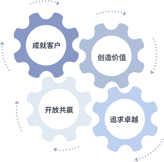 成就客户是一切决策的出发点,,创造价值是衡量所有工作的标准,,,追求卓越是我们做事做人的态度,,开放共赢是我们的格局也是最终的结果。。价值观的齿轮环环相扣,,,推动着组织里的每个人不断向前。。